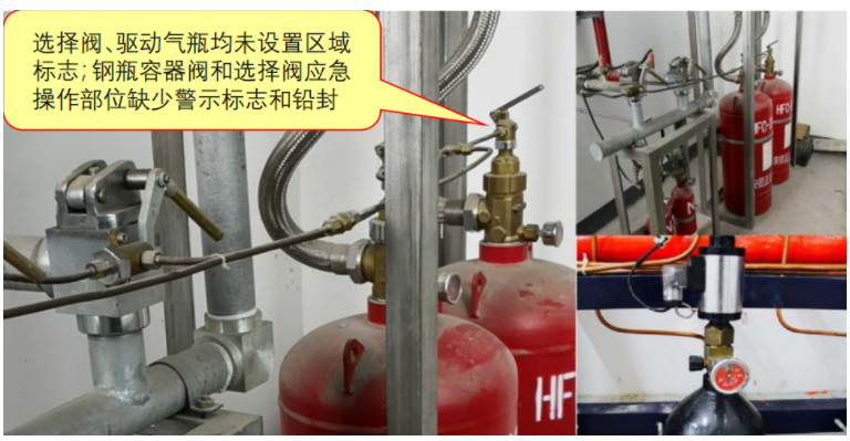 2)选择阀、驱动气瓶未设置区域标志;灭火剂钢瓶、驱动气瓶容器阀和选择阀手动控制与应急操作部位缺少警示标志和铅封;【图示2】